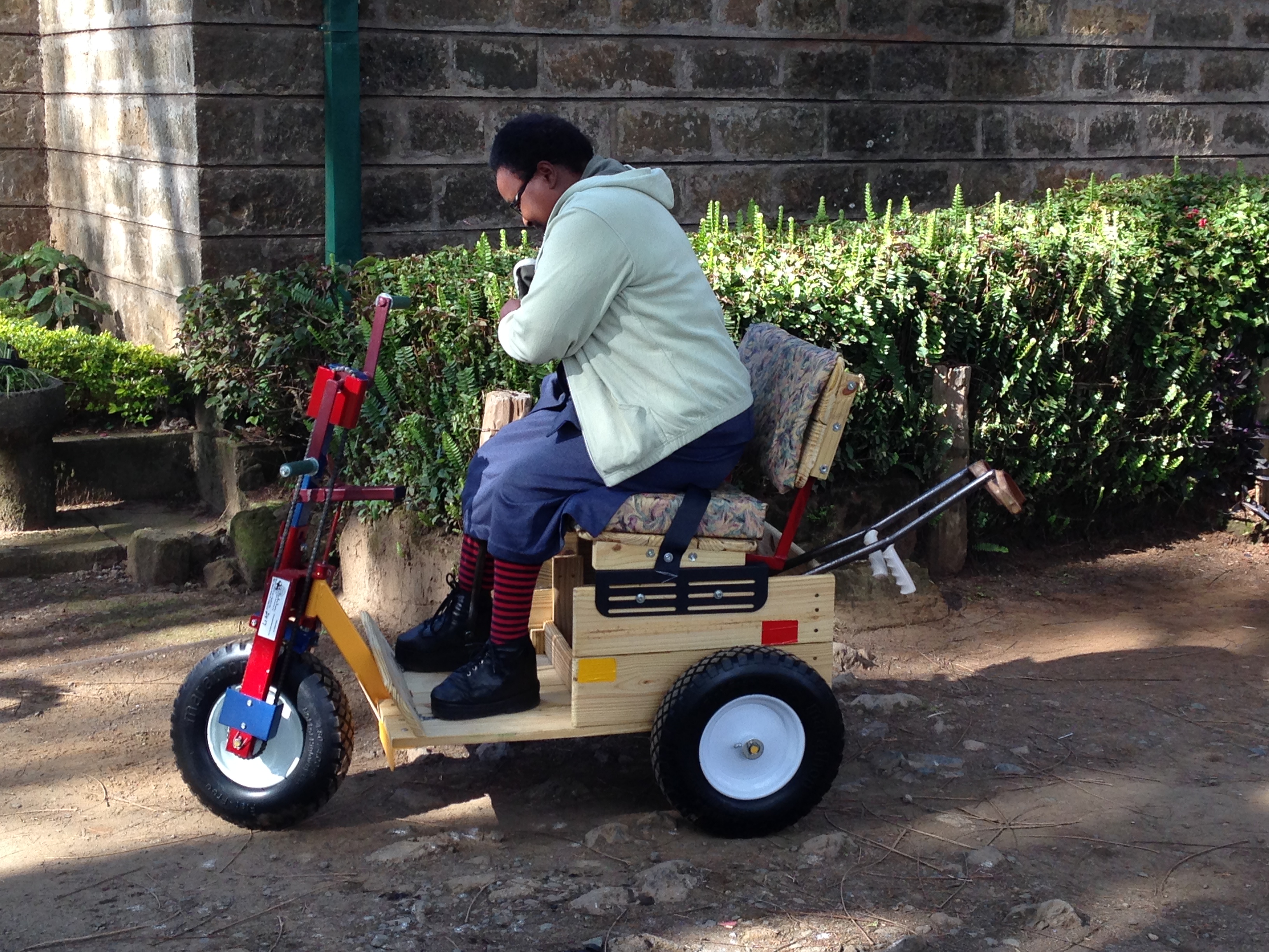 After some adjustment so she can easily reach the arm peddles, Zippy has her new PET. It will be able to transport her in the mud or whatever environment she may be in at any given time.